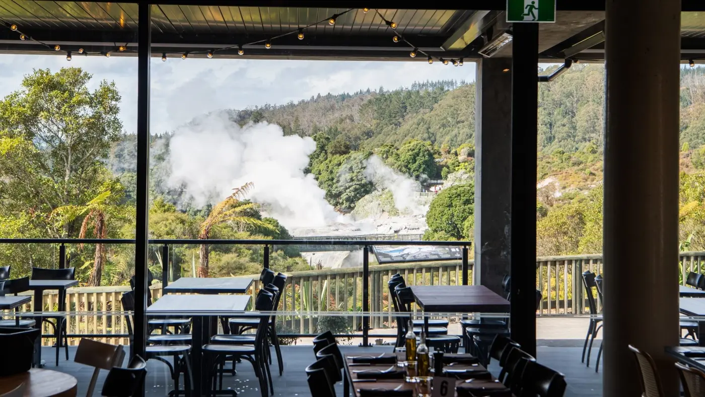 Hāngī lunch at Te Puia Pātaka Kai Restaurant – enjoy delicious kai set against a backdrop of geysers and stunning valley views.