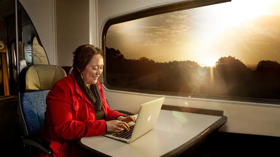 Te Huia connects the Waikato to Auckland, offering comfy seats, light and airy carriages, free Wi-Fi, an onboard café, tables, power and USB ports at every
